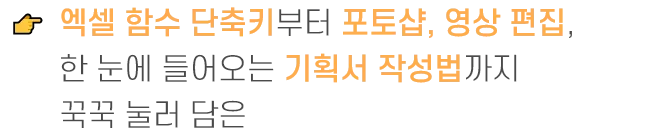 37개 과정. 실무에 바로 써먹는 MS오피스·어도비·한글·비즈스킬 스킬업 OA 패키지. 기본적인 문서작업부터 디자인까지 실무에 바로 적용 가능한 컴퓨터 활용 능력과 비즈니스 스킬을 학습함으로써 취업 준비 및 업무 능력을 향상시킬 수 있습니다.