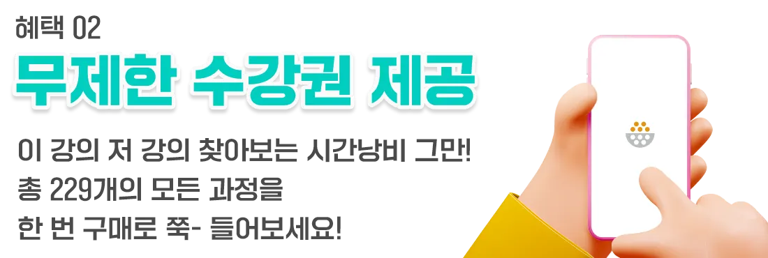 67개 과정. 전문 지식 영상플랫폼(다물어클럽) 외 다수의 플랫폼과 연계한 다양하고 수준 높은 인문·교양 패키지. 학습자 빅데이터 기반으로 제작한 유밥만의 콘텐츠로 소프트 스킬을 높이는 비즈니스·자기계발 과정까지 제공합니다.